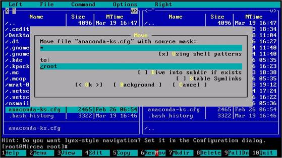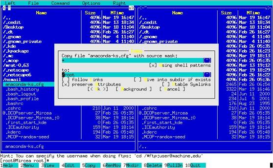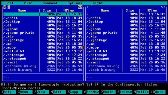 Midnight Commander este o "clona" a programului Norton Commander. Este un program de tip "shell" care asigura o interfata bazata pe meniuri. De regula este folosit pentru manipularea fisierelor si directoarelor, dar poate fi folosit si pentru transferuri prin ftp sau cautarea unui fisier pe disk.