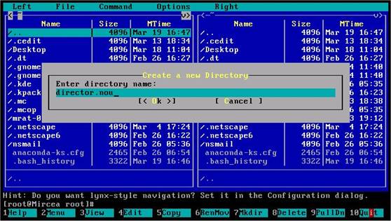 Apasand tasta "F7" puteti crea un director (nou) in directorul curent. Daca doriti sa-l creati in alta parte, trebuie mai intai sa schimati directorul curent. Dupa apasarea tastei "F7" va apare un dialog in care sunteti intrebat care va fi numele noului director. Tastati numele noului director si apasati "Enter"