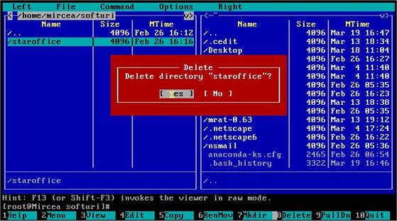 Se pozitioneaza cursorul pe fisierul (directorul) dorit. In cazul stergerii mai multor fisiere se selecteaza fisierele dorite folosind tasta "Insert". Se apasa tasta "F8", iar apoi se confirma stergerea cu ajutorul tastei "Enter".