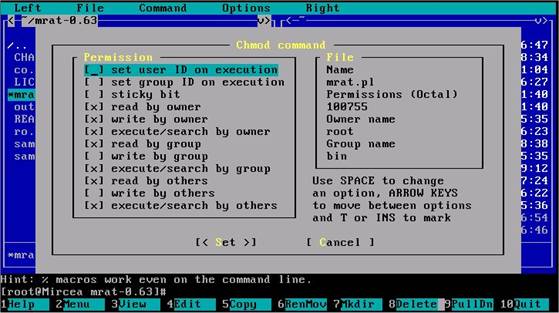 In caz de reusita, pe ecran va apare un dialog in care sunteti invitat sa modificati permisiunile asupra fisierului selectat. Selectarea se face cu mousele sau pozitionand cursorul pe permisiunea dorita si apasand "space". La sfarsit se apasa "[<set>]"