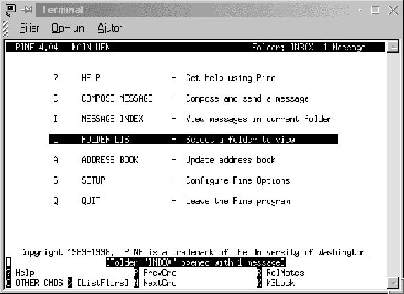 Mesajele noi (necitite) vor avea litera "N" in dreptul lor. Dupa ce pozitionati cursorul asupra mesajului dorit, apasand "Enter" puteti vedea mesajul. Dupa ce l-ati citit, apasand tasta "I" va puteti intoarce la cutia postala, sau apasand tasta "M" la meniul principal.