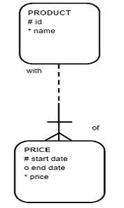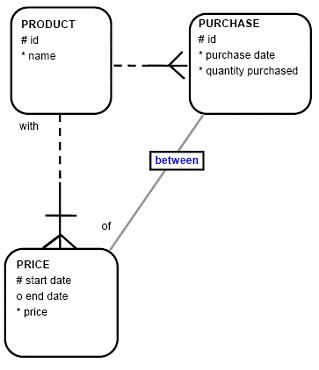 Luati in considerare ceea ce se intampla atunci cand vreti sa returnati un produs la un magazin. Ati cumparat acel produs la un anumit pret, iar acum are alt pret. Intreprinderile de multe ori trebuie sa tina o evidenta a modificarilor preturilor. In urmatoarea diagrama, vom presupune ca fiecare PURCHASE este de doar un singur produs. Pretul care a fost platit poate fi gasit prin introducerea datei cumpararii intre data de inceput si data de sfarsit din PRICE.