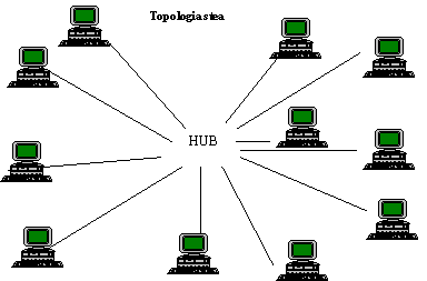 In topologia stea, calculatoarele sunt conectate prin segmente de cablu la o componenta centrala, numita concentrator (hub). Semnalele sunt transmise de la calculatorul emitator, prin intermediul concentratorului, la toate calculatoarele din retea.
