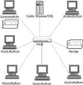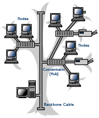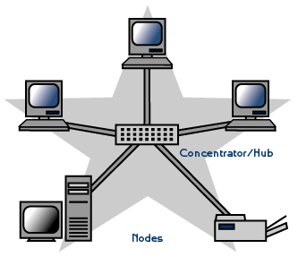 retele de tip stea (star) – conectarea tuturor sistemelor de calcul, precum si a echipamentelor periferice se face prin intermediul unui dispozitiv special numit concentrator sau hub. Astfel fiecare nod din retea are legatura directa cu hub-ul, realizandu-se astfel o legatura permanenta intre nodurile retelei. Reteaua functioneaza atat timp cat nodul central este in functiune, fiecare nod al retelei fiind independent de celelalte noduri.
