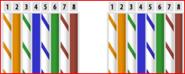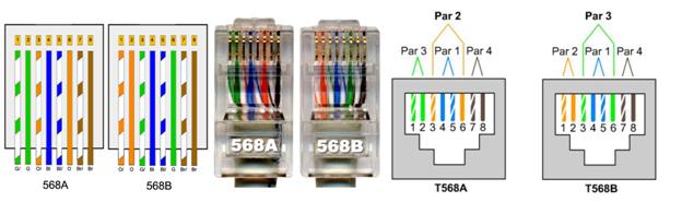 S-au creat si sunt aplicate anumite standarde atât în ceea ce priveste culoarea celor 8 fire, dar si ordinea de dispunere a acestora. Aceste standarde sunt consacrate în literatura de specialitate drept TIA/EIA 568A si TIA/EIA 568B. Pentru interconectarea echipamentelor de retea folosim unul dintre cele doua standarde. Cele mai multe retele sunt cablate în conformitate cu standardul TIA/EIA 568B (în Europa). Cablurile UTP / STP / FTP folosesc doar patru fire din cele opt disponibile pentru transmiterea si receptia datelor în retea. Cele patru fire folosite pentru receptia si transmisia datelor sunt: portocaliu, portocaliu-alb, verde, verde-alb. Pinii folositi la transmiterea datelor sunt pinii 1 si 2, în timp ce pinii 3 si 6 sunt utilizati pentru receptia informatiei. Deci se folosesc doua fire pentru transmisie (Tx+ si Tx-) si doua pentru receptie (Rx+ si Rx-).