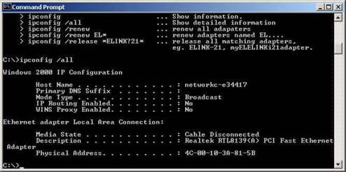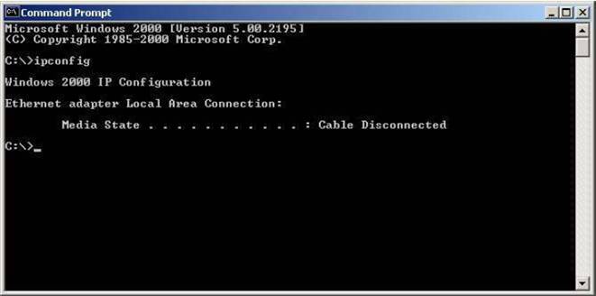 Pentru a fi siguri ca problema vine din partea cablului ce nu este conectat sau a calculatoarelor ce nu sunt puse in functiune apelati comanda “ipconfig” si analizati rezultatul acesteia: