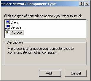 Accesati meniul “Start”->”Settings”->”Control Panel” si executati dubluclick pe pictograma “Network and Dial-Up Connections”. Dati click stanga pe pictograma retelei si executati optiunea “Propreties”. In aceasta fereastra apasati butonul “Install” si dati click pe pictograma “Protocol” dupa cum este afisat: