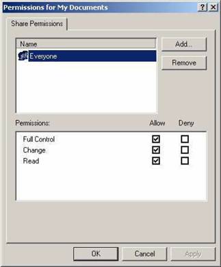 Observati din imagine persoanele ce au drept asupra resurselor. In cazul de fata “Everyone” adica oricine are drepturile bifate in cadrul sectiunii “Permissions” - an exemplul de mai sus, oricine poate avea control integral asupra resurselor partajate. (modificare/citire).
