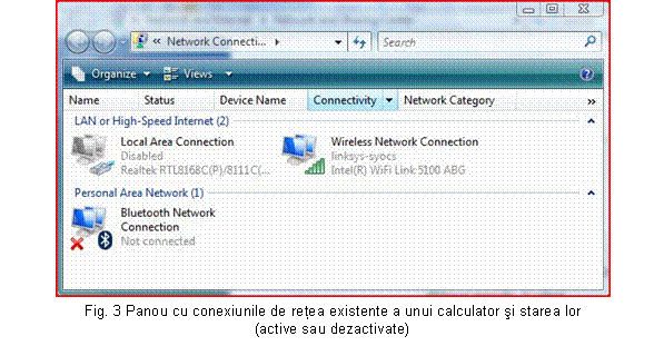 c) Daca suntem siguri ca problema nu este cauzata de cabluri, conectori sau de nefunctionarea unui concentrator (hub, switch), pasul urmator este verificarea placii de retea. Daca ledul indicator al placii nu arata semne de functionare, trebuie verificat daca placa este conectata corespunzator in slotul de expansiune a placii de baza. Daca conexiunile fizice sun 525b16f t in regula, probabil ca trebuie schimbata placa de retea. Daca placa functioneaza corect, in panoul Conexiuni de retea a sistemului de operare verificam daca conexiunea este activata sau dezactivata (Fig. 3). Urmeaza verificarea configuratiei TCP/IP a calculatorului.