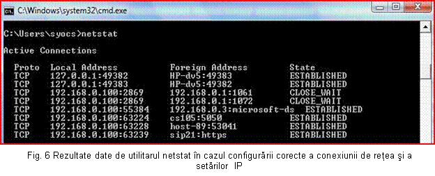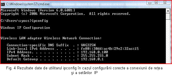 d) Folosind comanda ipconfig putem afisa configuratia TCP/IP curenta (Fig. 4). Acest utilitar trebuie executat