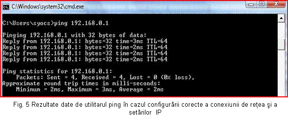 Sintaxa comenzii este: ping adresa_IP_a_computerului_de_la_distanta (Fig. 5).