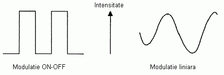 Emitatorul optic de baza converteste semnalele electrice de intrare in lumina modulata pentru transmisie pe o fibra optica. In functie de natura semnalului, lumina modulata rezultata poate fi oprita sau pornita sau poate fi variata liniar in intensitate intre doua nivele predeterminate. Figura 2.4 prezinta o reprezentare grafica a acestor doua metode de baza.