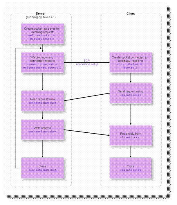 Asadar, functia serverului este de asculta pentru o conexiune. Aceste lucru este realizat printr-un obiect server care a fost special creat. Functia clientului este de a incerca sa stabileasca o conexiune cu serverul pentru care este creat un obiect client. Odata stabilita conexiunea, se poate observa ca la cele doua capete (server si client), conexiunea este transformata intr-un obiect IO Stream si din acel moment aceasta poate fi tratata ca si cum s-ar scrie sau s-ar citi dintr-un fisier.