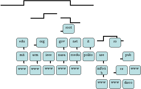 Organizarea ierarhicǎ poate fi observatǎ atunci cand se studiazǎ treseul unei cereri de [] a adresei IP asociate unui nume simbolic. Un calculator client care are nevoie de adresa asociatǎ unui server S va trimite o interogare cǎtre unul din serverele de nume locale ale []. Dacǎ numele serverului este local, atunci se primeste imediat rǎspunsul, altfel serverul [] va interoga un server plasat mai sus in ierarhie, cererea putand ajunge panǎ la rǎdǎcina serverului de nume.