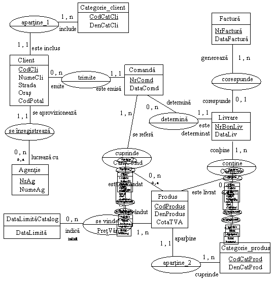 Clienti (CodCli, NumeCli, Strada, Oras, CodPostal, #CodCatCli, #NrAg)