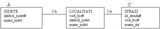 Observatie: În exemplul de mai sus, relatia LOCALITATI realizeaza jonctiunea între relatiile JUDETE si STRAZI, stocând informatiile privind numele judetului "nume_judet", simbolul judetului "simbol_judet" si identificatorul localitatii "cod_loc".
