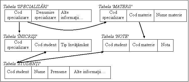 Între tabelele STUDENŢI' si 'ÎNSCRISI', relatia dintre entitatile celor doua tabele se va realiza prin câmpul(atributul): 'Cod student(CNP)'. În acest fel, se poate acum stii care este codul specializarii la care este înscris fiecare student, dar informatia folosita pentru aceasta legatura('CNP') se va gasi în ambele tabele;