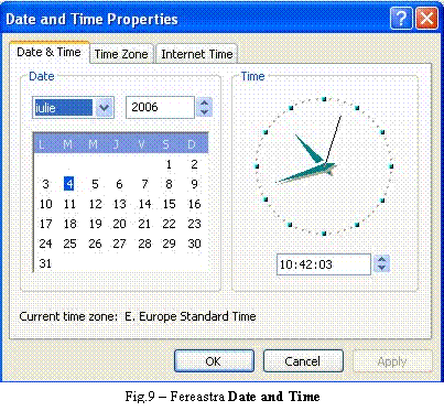 Sectiunea (Fig.9 ) ne permite modificarea datei si orei care sunt afisate de ceasul SO, ajustarile facute de noi fiind apoi preluate de toate programele pe care le-am instalat. Modificarea lunii se realizeaza facând clic pe sagetuta de lânga câmpul lunilor si apoi facând clic pe luna dorita din meniul derulant care apare. Modificarea anului se realizeaza facând clic pe sagetuta în sus sau pe cea în jos de lânga câmpul anilor. Modificarea zilei se realizeaza facând clic pe ziua corespunzatoare din calendarul afisat. Modificarea orei, a minutelor si secundelor se realizeaza selectând portiunea dorita (ore, minute, secunde) si apoi facând clic pe sagetuta în jos sau pe cea în sus de lânga câmpul orei. O varianta mai simpla este sa selectam portiunea dorita si apoi sa scriem numarul dorit de la tastatura (de ex. daca vrem sa schimbam numarul minutelor de la 27 la 46 si nu dorim sa folosim sagetuta în sus). Orice modificare a orei (minutelor, secundelor) nu intra în vigoare decât dupa ce facem clic pe butonul "Apply" sau pe butonul "OK".