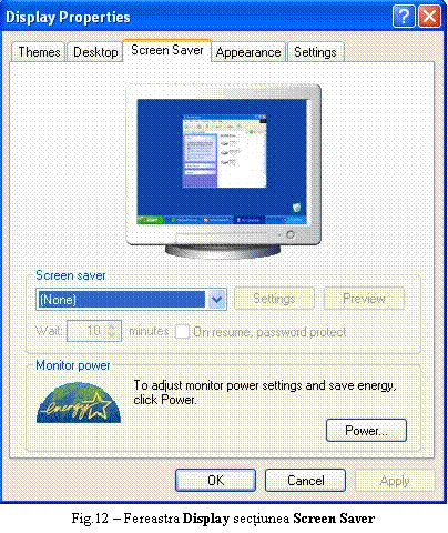 Avem posibilitatea sa alegem protectorul de ecran preferat dintr-un meniu care contine toate fisierele cu extensia SCR (de la "screen saver") aflate în dosarul de la adresa C:\Windows\System. Putem de asemenea sa folosim un protector descarcat de pe Internet, dar în acest caz trebuie sa-l scanam în prealabil cu un program antivirus actualizat. În cazul în care nu dorim sa folosim protectorul de ecran va trebui sa facem clic pe optiunea "None", eventualitate care trebuie luata în consideratie daca folosim în mod frecvent jocuri care au nevoie de cât mai multe din resursele calculatorului pentru a rula fluid. Dupa ce am ales protectorul, îl putem configura facând clic pe butonul "Settings" si modificând optiunile (complexitate, dimensiune, etc.) prezente în fereastra care apare. Pentru a vedea rezultatul modificarilor va trebui sa facem clic pe butonul "Preview" pentru ca protectorul sa fie afisat pe tot ecranul, iar daca dorim sa revenim la fereastra "Screen Saver" miscam un pic mouse-ul. Alegerea perioadei de inactivitate dupa care protectorul sa intre în functiune se realizeaza de la optiunea "Wait" cu ajutorul sagetutelor sau a tastaturii (selectam numarul de minute existent si apoi scriem altul). Dupa ce am facut toate modificarile, facem clic pe butonul "Apply" sau pe butonul "OK" pentru ca protectorul sa intre în functiune. Calculatorul va sesiza aparitia unei perioade de inactivitate (în care utilizatorul nu apasa nici o tasta sau nu misca mouse-ul) si daca aceasta depaseste timpul setat de utilizator este lansat în executie protectorul. Utilizatorul poate întrerupe protectorul apasând o tasta sau miscând mouse-ul.