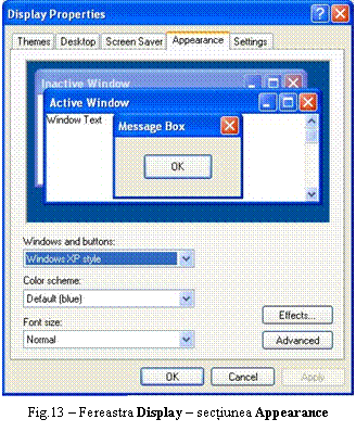 Permite alegerea unui aranjament coloristic pentru elementele de interfata (ferestre, casete de text, etc.), indiferent daca acestea apartin unor programe preinstalate o data cu Windows sau unor programe instalate de utilizator. Fereastra are o rubrica în care putem previzualiza diversele aranjamente coloristice si mai multe meniuri derulante care ne permit personalizarea majoritatii elementelor de interfata din punct de vedere al culoriii, dimensiunii si a corpului de litera ("font") afisate. Meniul "Color Scheme" ne permite alegerea unui aranjament coloristic complet care sa se aplice în mod unitar tuturor elementelor de interfata.