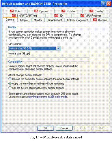 Permite efectuarea de reglaje referitoare la modul în care placa video afiseaza imaginea pe ecranul monitorului. În aceasta fereastra avem un buton numit "Advanced" pe care daca facem clic va apare o multifereastra în care putem regla mai multe aspecte privitoare la functionarea placii video si a monitorului. Aceasta multifereastra este ilustrata în Fig.13.