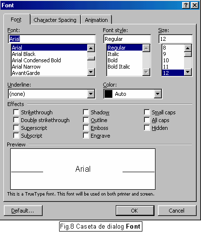 Fiecare caseta de dialog contine obiectele numite instrumente de control sau optiuni, care va permit sa realizati diferite operatiuni. De exemplu, caseta de dialog Font a meniului Format (figura 8) ne specifica cu ajutorul instrumentelor de control (optiuni) modul de formatare a caracterelor si anume: setul de caractere ales (Font), modul de scriere (Regular, Bold, Italic sau Bold Italic), marimea caracterelor (Size), subliniere (Underline), culoarea de scriere (Color), o serie de efecte (Effects) etc. Efectele se selecteaza, dupa preferinte, efectuând un clic pe ele.