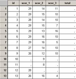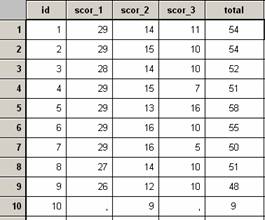 Imaginea alaturata reprezinta o tabela de date SPSS care cuprinde scorurile la trei examene partiale (scor_1, scor_2 si scor_3). Dorim sa realizam o variabila care sa cuprinda un scor general, prin insumarea celor trei variabile.