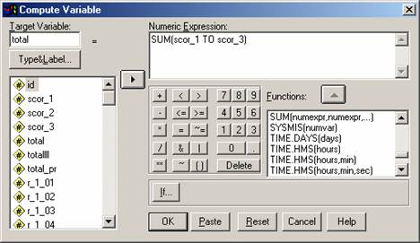 Daca variabilele ce vor fi insumate se afla in baza de date una dupa alta, ca in cazul exemplului nostru, atunci avem posibilitatea sa scriem o expresie de insumare simplificata, astfel SUM (prima_variabila TO ultima_variabila). In acest caz, clauza TO va fi cuprinsa intre blankuri, pentru a nu fi confundata cu un nume de variabila. Aceasta optiune ne sugereaza cat de important poate fi sa aranjam corespunzator variabilele in structura unei tabele SPSS.