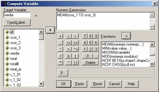 Presupunand ca in loc de suma, ne-ar interesa media variabilelor, se procedeaza in mod similar. Expresia de calcul a mediei este MEAN (expresie_numerica, expresie_numerica, ), unde arata ca putem pune oricate variabile (sau valori) numerice, cu virgula intre ele. Ca si in cazul sumei, se poate realiza o expresie cu clauza TO, cu conditia ca variabilele pentru care se realizeaza media sa se afle una dupa alta in tabela SPSS.