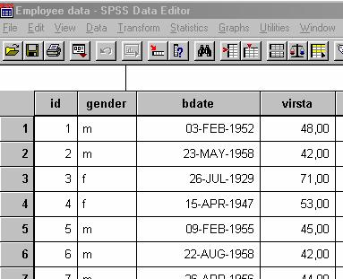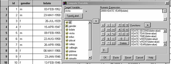 SPSS ofera functii de transformare cu variabilele de tip cronologic. Dintre acestea, vom exemplifica cu realizarea unei variabile care sa contina anul nasterii, sa zicem, scos dintr-o variabila care contine data nasterii.