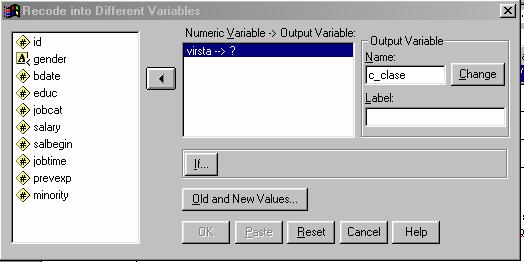 Atentie, se poate alege si optiune Into Same Variables, dar nu este recomandabila deoarece, in cazul unei erori, nu mai avem la dispozitie variabila initiala pentru o noua recodificare.