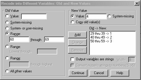In zona Old value, se alege una dintre variantele de definire a valorilor de la care se pleaca. Sa zicem ca am ales solutia sa recodificam anii pe intervale de zece ani, primul interval fiind 29-39, al doilea 40-49, s.a.m.d.
