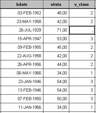 Pentru valoarea 71, avem missing value in variabila v_clase, deoarece nu am definit un interval care sa cuprinda aceasta varsta. (De regula, aceasta situatie este determinata de o eroare de definire a intervalelor de clasa. Pentru a o repara, ar trebui sa intram din nou in procedura Recode si sa redefinim clasele).
