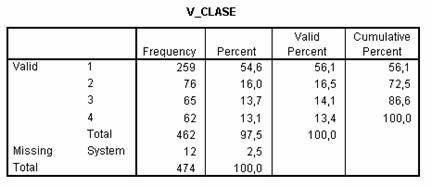 Daca rulam procedura Frequencies (din meniul Statistics-Summarize), obtinem in Output afisarea distributiei de frecvente a variabilei create de noi (v_clase).