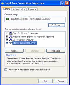 stabilirea adresei IP se executa dublu click pe pictograma Local Area Connection din fereastra Network connections si se va deschide fereastra Local Area Connections Status iar apasand butonul Properties se va afisa fereastra Local Area Connection Properties (proprietatile conexiunii la reteaua