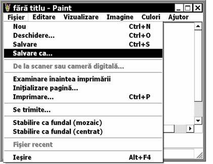 Fisierul creat poate fi închis fie odata cu programul Paint - comanda Iesire (Exit) sau prin deschiderea unui nou fisier - comanda Nou (New) (comenzi aflate în meniul Fisier (File) ).