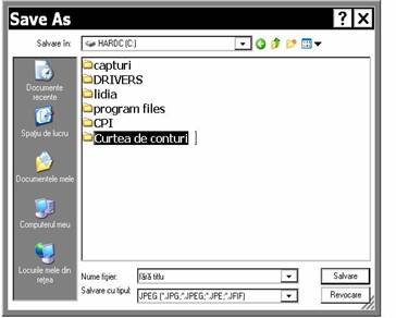 în caseta care se deschide, selectam în zona Salvare în: (Save in:) discul (de exemplu HARDC ([C:]), apoi selectam folderul în care dorim sa salvam (dublu clic pe acesta)