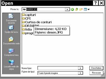 apoi selectam folderul în care se afla fisierul respectiv (dublu clic pe acesta); în zona din mijloc a casetei apare continutul folderului: