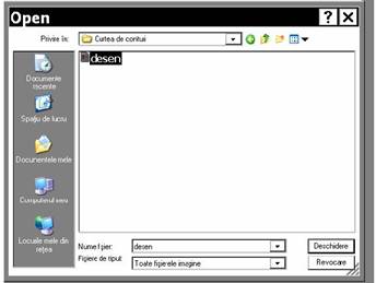 Desenul pe care l-ati realizat puteti sa-l deschideti ulterior pentru vizualizare, modificare, imprimare, folosind comanda Deschidere..(Open.) din meniul Fisier (File), astfel: