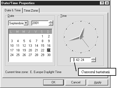 Pentru a preciza ora dorita, se executa un clic în grupul de cifre ce indica ora (mouse-ul se transforma într-o linie verticala, asemanatoare literei I), apoi folosind tastele Backspace (care sterge un caracter spre stânga) si Delete (care sterge câte un caracter spre dreapta) se sterge numarul respectiv, iar în final se tasteaza ora dorita. Asemanator se procedeaza pentru a stabili minutele si secundele.