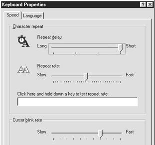 Cu Repeat delay se precizeaza cât de mult trebuie tinuta apasata tasta pentru a se repeta, iar cu Repeat Rate cât de des se va repeta apasarea tastei (frecventa de repetare). Mai jos este o zona de editare ce permite testarea parametrilor, iar Cursor blink rate permite stabilirea frecventei de pâlpâire a cursorului tastaurii.
