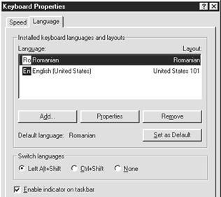 Dupa cum se vede, se pot adauga tastaturi (cu butonul Add), se pot elimina (cu Remove), se poate alege un anumit tip de tastatura pentru fiecare limba (cu Properties), se poate stabili tastatura implicita (cu Set as Default), precum si combinatia de taste cu care se poate comuta între tastaturi (butoanele de selectie din zona Switch Languages).