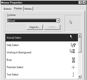 Eticheta Pointers permite stabilirea formei cursorului mouse-ului pentru diferite stari ale sarcinilor aflate în executie.