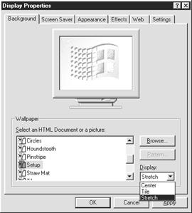 Eticheta Background stabileste fundalul Desktop-ului. Se poate alege o imagine (fotografie, sigla, etc., eventual desenata cu Paint), folosind butonul Browse.