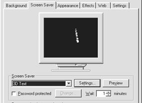 Eticheta Screen Saver permite stabilirea unei animatii care sa se desfasoare pe ecran, daca nu se apasa nici o tasta sau nu se foloseste mouse-ul o perioada de timp, stabilita în zona Wait. Optional se poate stabili si o parola pentru reluarea lucrului, folosind butonul Password protected.