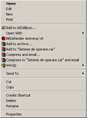 Se alege optiunea Properties (proprietati), deschizandu-se fereastra cu caracteristicile folderului sau a fisierului solicitat.
