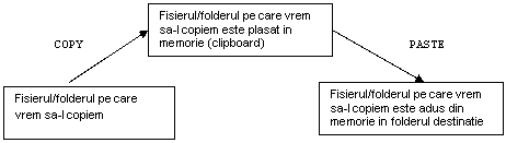 In fereastra folderului destinatie alegem comanda Paste (lipeste) din meniul Edit - comanda care aduce folderul/fisierul pe care vrem sa-l copiem, din zona de memorie (clipboard). Schematic copierea s-ar putea reprezenta in felul urmator: