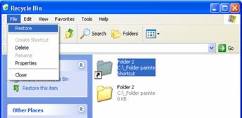Recuperarea unui folder, fisier sau grup de foldere sau fisiere presupune selectarea acestora si apoi alegerea optiunii Restore din meniul File al ferestrei Recycle Bin.