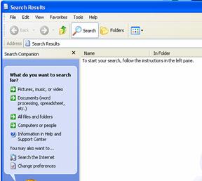 Windows-ul are posibilitatea de a cauta fisiere sau foldere si sa le afiseze intr-o fereastra. Pentru aceasta se foloseste instrumentul Search activat din meniul butonului Start. Selectarea acestei comenzi va avea ca efect afisarea ferestrei de dialog Search Results. In fereastra Search Results se executa click pe optiunea All Files and Folders (toate fisierele si folderele) din stanga ferestrei.