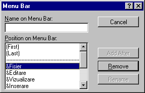 Pentru redenumirea unui meniu din bara de meniuri, īn lista Position on Menu din caseta Menu Bar selectati meniul pe care vreti sa īl redenumiti. īntroduceti noul nume al meniului īn rubrica Name on Menu. Executati un clic pe butonul Rename.